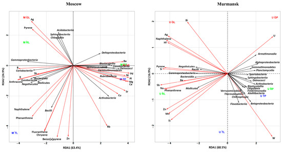 RDA ordination triplot showing the correlations of chemical pollutants (red arrows) and bacterial classes (black arrows) of the leaf dust and road dust from Moscow and Murmansk. The first letter in the abbreviation refers to the city: M–Moscow, U–Murmansk; the second letter refers to the functional zone: T–traffic, R–residential, G–recreational; and the last letter refers to the biotope: L–leaf, P–paved surface. The figures show only those classes of bacteria, metals, and PAHs that had a correlation with each other.