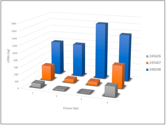 The amount of cDNA generated was calculated from the qubit quantitation value. Even though all primer sets essentially contain the same 12 or 13 nucleotide sequence homologous to the influenza RNA segments, the amount of products generated was variable (Figure 1). For example, the RNA from sample 245626 had a 38-fold difference among the four primer sets.