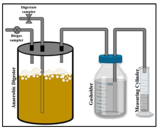 The biogas digester was equipped with three outlets; one for digestate sampling, one for gas sampling and one for collection and quantification of total biogas, as depicted in Figure 1. Each bottle was flushed with nitrogen gas (2–3 min) to achieve anaerobic conditions. The digestate and biogas samplings were carried out daily. The digestate was analyzed for volatile solids content and pH (pH/mV meter HΙ 8014-Hanna Instruments). The biogas samples containing CH4, CO2 and other trace gases, such as H2, H2S, N2, CO [trace content 1–5% [93]; approximately 3% is assumed in the equation below] were analyzed using the slightly modified potassium hydroxide assay [94] to indirectly calculate the methane content (MC, %). Briefly, a specific volume of biogas (Volume A) was injected into an airtight borosilicate glass bottle containing saturated KOH solution through a syringe inserted into the inlet tube of the bottle’s cap. The CO2 contained in the biogas reacted with the potassium hydroxide to form soluble potassium carbonate (K2CO3), while the remaining gas consisting mainly of methane was directed into the outlet tube, in which a glass syringe was fitted. The displacement of the piston, which is due to the pressure of the exiting gas, indicates the remaining biogas volume (Volume B). Therefore, the CO2 and CH4 contents are calculated according to Equations (A11) and (A12) (Appendix A), respectively [94].