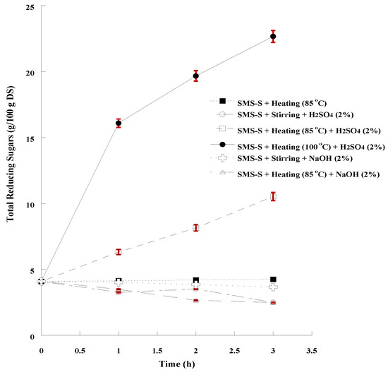 According to the results, the combination of thermal (100 °C) and acidic (H2SO4, 2%) chemical treatment resulted in the most efficient hydrolysis of SMS (HY = 43.6 %) and the highest concentration of total reducing sugars (22.67 g/100 g DS) in a 3-h long process. On the contrary, no additional free sugars were released, when SMS were treated by heating only, while a decrease was observed in acid hydrolysis without thermal process, which could be attributed to a possible conversion of free sugars to furfurals and hydroxy-methyl furfurals (HMF), the derivatives of pentose and hexose dehydration, respectively [92,100]. According to Wu et al. [39] the combination of acidic treatment and thermal process was the most efficient hydrolytic process, especially when sulfuric acid (2%) was used and temperature was 121 °C; 31.5 g of reducing sugars per 100 g raw SMS were determined, indicating that a higher temperature could increase the hydrolysis efficiency, which is also confirmed by the results of Qiao et al. [28].