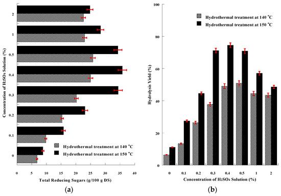 (a) Graphical presentation of Total Reducing Sugars (g/L) resulting from the hydrolytic combination of acidic chemical treatment (using various concentrations of acidic), and hydrothermal treatment at 140 or 150 °C. (b) Graphical presentation of hydrolysis yield (%) of acidic chemical treatment (using various concentrations of acidic), combined with hydrothermal treatment at 140 or 150 °C. The presented results are the mean of three independent analyses.