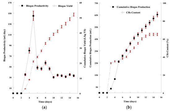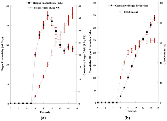 The alkaline hydrolysate derived from 2% NaOH treatment and hydrothermal process at 150 °C was diluted as well and mixed with the inoculum (1:1 ratio). The graphical demonstration for the 15-day AD of the alkaline hydrolysate is presented in Figure 5a,b. In this case, biogas production started 5 days after inoculation. The pH value remained also in the range of 6.5–8.0 during AD. The daily productivity stabilized (29.0 ± 1.8 mL/d) after 12 days and the total biogas production of the 15-day AD was 338 ± 8.6 mL. The volatile solids content in the mixture decreased by 0.9 units to a final value of 1.63 ± 0.11% resulting in a biogas yield of 37.0 ± 2.9 L/kg VS and methane content of 62.1 ± 2.6% at the end of AD.