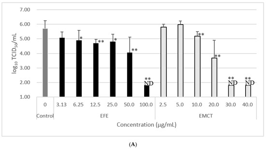 Effect of EFE or EMCT treatment against the growth of SARS-CoV-2 WK-521 strain in vitro at 24 h post-infection. The titer of virus within culture supernatant decreased in a dose-dependent manner. (A) EFE or EMCT was added 2 h before virus inoculation. (B) EFE or EMCT was added 2 h after virus inoculation. Data are presented as mean ± standard deviation. ND, not detected. Significant differences as compared with control (0 µg/mL) *; p < 0.05. **; p < 0.01.
