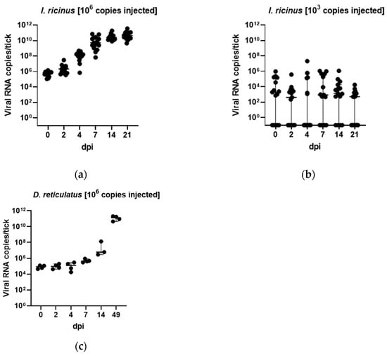 Next, we aimed to analyze the ability of ALSV to replicate in the potential vector tick I. ricinus and D. reticulatus. The ticks injected with ALSV RNA-positive tick homogenates were tested for ALSV RNA copy numbers at days 0, 2, 4, 7, 14 and 21. We found a high increase in viral RNA copies between day 2 and 7 in I. ricinus ticks injected with 106 viral copies per tick with values of up to 1010 copies/tick, whereas the increase in viral copies from day 7 to 21 was less intense (Figure 1a). In the group injected with 103 viral copies per tick, an overall increase was not observed (Figure 1b), and even many samples were negative for ALSV RNA at the given time points. In D. reticulatus ticks, a slight increase in ALSV RNA copies was observed between day 0 and 7 and day 14. The highest viral RNA copy numbers were detected at day 49, with values up to 1011 copies/tick (Figure 1c).