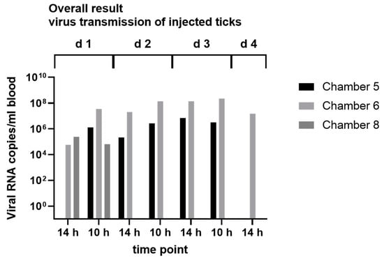 Results of virus transmission experiments with ALSV-injected ticks. ALSV RNA copies/mL blood were measured on 7 different time points (1–7) after 10 h (sampling in the afternoon) or 14 h (sampling in the morning) of incubation of ALSV-injected ticks in feeding chambers 5, 6 and 8. Feeding experiments lasted 3½ days.