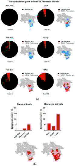 (a) Seroprevalence of wild and domestic animals based on LIPS data (red: positive serum sample(s) in this area; blue: serum samples screened in this area; grey: not screened); (b) overall seroprevalence of domestic or wild animals. Detailed map information in Figure S1. Maps were created in R v. 4.1.0 with administrative boundaries retrieved from the Global Administrative Areas Database (gadm.org).