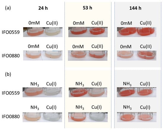 Visible changes in color and turbidity of Rhodosporidium toruloides IFO0559 and IFO0880 during shaking flask cultivation. (a) Cultivations without supplement (0 mM) versus with 0.5 mM Cu(II). (b) Cultivations with 0.03% ammonia (NH3) versus with 0.03% ammonia (NH3) and 0.5 mM Cu(I).