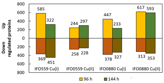 Time-resolved quantitative proteomics was performed to elucidate the cellular response of R. toruloides to copper stress. With this method, proteins (significance ≥ 2, fold change ≥ 2, detected in at least one sample per group, LFQ by PEAKS Studio, Tables S1 and S2 Supplementary Materials) could be detected as differentially regulated at time point 96 h and 144 h in Cu(I) and Cu(II) stress. Different databases were used for IFO0559 and IFO0880, as the genomes vary between those two haplotypes. These strain-specific databases differ in protein annotation, which makes the comparison of the two haplotypes challenging as proteins can be detected under different names or are only included in one of the two databases. The highest number of differentially expressed proteins was detected in the comparison of IFO05559 at 0 mM to 0.5 mM Cu(I) after 96 h with 954 proteins, including 585 upregulated and 369 downregulated proteins. For IFO0880, the comparison of 0 and 0.5 mM Cu(II) treatment at 144 h resulted in a maximum of 946 differentially expressed proteins, with 593 upregulated and 353 downregulated proteins (Figure 5).