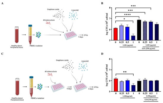 Effect of GO-LZD combination during Mtb in ex vivo hPBMC infection model. The GO-LZD effect on Mycobacterium tuberculosis survival was evaluated in ex vivo human PBMC infection model. Graphene Oxide at a final concentration of 250 µg/mL was administered alone or in combination with LZD at a final concentration of 0.25, 0.5 and 1 µg/mL. Peripheral Blood Mononuclear Cells were infected with 6 × 104 CFUs of Mtb H37Rv strain (Multiplicity Of Infection, MOI 1:1 based on monocyte percentages) and GO or GO+LZD solutions were administered as co-infection treatment or as 4 days post-infection treatment. Schematic representations of experimental setting (A,C); Bacterial survival was evaluated 7 days post-infection through CFU count and are represented in logarithmic scale (B,D). Each experiment was repeated three times. When GO was added as co-infection treatment, there was a decrease in CFU count at 7 days post-infection only with LZD 1 µg/mL (MIC concentration) with respect to untreated cells (not significant), while when GO alone was added, or in combination with LZD 0.25, 0.5 and 1 µg/mL there was a higher bacterial replication (B). In post-infection treatment, only when LZD at MIC point was added there was a decrease in CFU count. With GO alone or in combination with LZD, bacterial load was comparable with control (D). (* p value < 0.05; ** p value < 0.01; *** p value < 0.001, **** p value < 0.0001).