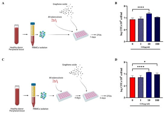 Effect of GO during Mtb ex vivo hPBMCs infection model. To confirm GO impairment of infection control, hPBMC infection models in Figure 1 were repeated with GO alone at 1, 10 and 100 µg/mL, without LZD (A,C). Bacterial survival was evaluated through CFU count and represented in logarithmic scale (B,D). When GO was added as co-infection treatment, there was an increase in CFU count (not significant for 1 and 100 µg/mL and p value < 0.0001 for GO 10 µg/mL). When it was added as post-treatment, there was still an uncontrolled bacterial growth (p values, respectively, =0.0270 for GO 10 µg/mL and <0.0001 for GO 100 µg/mL). (* p value < 0.05; **** p value < 0.0001).