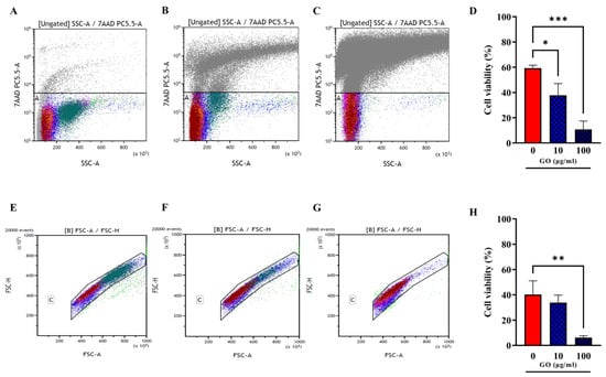 There are conflicting results on the toxicity of GO on hPBMCs, with some studies indicating a clear toxic effect and others showing no impact on hPBMC viability and proliferation potential [,,]. To investigate the effect of GO on hPBMCs, we used flow cytometry analysis to pinpoint the viability of the different cellular subsets. Peripheral Blood Mononuclear Cells were incubated with GO (10 and 100 µg/mL) and one hour later cell viability was assessed measuring the 7AAD PC5.5-A signal (Figure 3A–C). Positive 7AAD PC5.5-A cells indicating cell death and viability were reported as percentage of total events (cells). Debris and doublets were removed from the 7AAD+ cell population by using Forward scatter Height (FSC-H) versus Forward Scatter Area (FSC-A) gating. As shown in Figure 3D–H, the treatment of hPBMCs with GO significantly reduced cell viability in a dose-dependent manner.