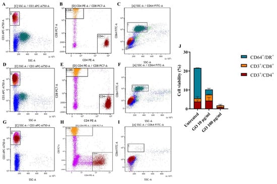 Lymphocyte (CD3 positive cells distinguished among CD4 and CD8 positive cells) and monocyte (CD64 positive population) viability was further evaluated separately (Figure 4A–I). Whereas treatments with GO at 100 µg/mL slightly impaired CD4+ lymphocytes, no significant effect was observed on the CD8+ component. Conversely, both concentrations of GO significantly affected monocyte viability (Figure 4J).