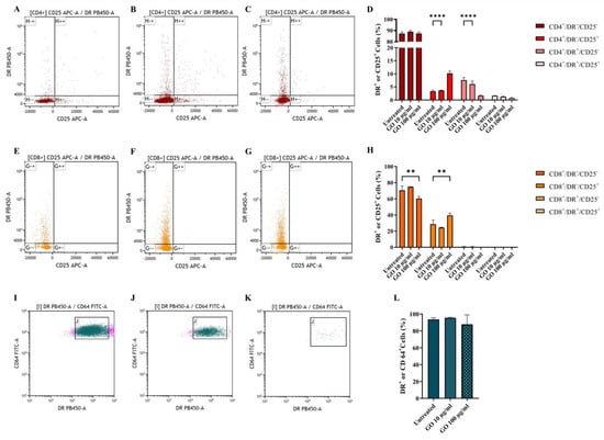 Finally, we assessed cell activation through GO stimulation by measuring the markers CD25 (early activation) and DR (late activation) [,], as reported in Figure 5A–C,E–G, representing CD4+ and CD8* lymphocytes, respectively. Graphene Oxide exposure did not prompt the massive activation of CD4+ (Figure 5D) and CD8+ lymphocytes (Figure 5H). On the other side, monocyte activation was evaluated via DR exposure measurement (Figure 5I–K), which is down-regulated when monocytes maturate towards a differentiated phenotype. Despite the significant loss of viable monocytes after GO treatment, monocytes showed no sign of activation (Figure 5L).