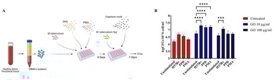 Moreover, hPBMCs pre-stimulated either with Mtb H37Rv (MOI 1:10.000), 1 µg/mL of tuberculous Purified Protein Derivative (PPD), or Phorbol Myristate acetate (PMA) at final concentration of 50 ng/mL, were infected simultaneously with Hygromycin B-resistant Mtb (MtbHyg) and simultaneously treated with GO at final concentrations of 10 and 100 µg/mL. Bacterial survival was evaluated 7 days later, assessing CFUs by plating on 7H11 solid medium (BD DifcoTM) enriched with 50 µg/mL Hygromycin B.