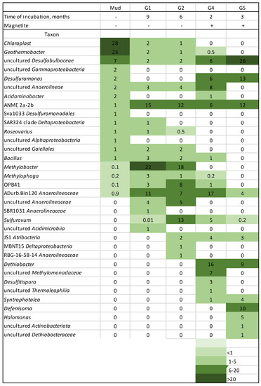 In each enrichment culture, taxonomic diversity was determined at the end of incubation. Thirty-four taxa at the genus level occurred at least once in a proportion of more than 1% of the total prokaryotic abundance in all enrichment cultures (Figure 2). Only three genera with a relative abundance of more than 1% were constantly present in all enrichment cultures—uncultured Desulfobulbaceae, ANME 2a–2b, and ADurb.Bin120 (Anaerolineaceae). The relative abundance of ANME 2a–2b increased from 1% in the mud sample to 6–15% in the enrichment cultures. Controls incubated without methane showed a significantly lower abundance of ANME 2a–2b (0.7–0.9%). The relative abundance of uncultured Desulfobulbaceae and ADurb.Bin120 Anaerolineaceae in the enrichment culture G5 was 26% and 4%, respectively. Other bacteria present in G5 were represented by Desulfuromonas (13%), Deferrisoma (10%), Dethiobacter (9%), Halomonas (5%), and JS1 Atribacteria (3%).
