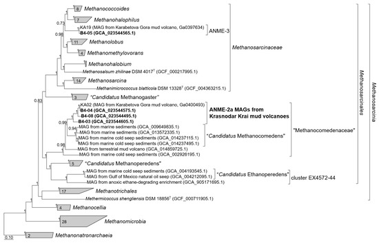 Enrichment culture G2 contained two large populations of ANME-2a represented by MAG B4-03 and MAG B4-04 with a relative abundance in the metagenome of 53.8% and 30.2%, respectively. According to phylogenomic reconstruction based on 53 archaeal single copy conserved marker genes [56], all ANME-2a genomes from Krasnodar Krai mud volcanoes form a separate genus-level lineage mostly related to recently named genus “Candidatus Methanocomedens” [57] (Figure 3). The difference between the «Krasnodar group» and Methanocomedens is also confirmed by average nucleotide identity (ANI) analysis: the average ANI within the Methanocomedens group is 93.4%, the average ANI within the «Krasnodar group» group is 87.6%, while the average ANI between the genomes of these groups is 83.3%. The same picture is for AAI: 90.4%, 80.4%, and 72.3%, respectively. The MAG of ANME-3 microorganism is closely related to MAG from the Karabetova Gora mud volcano, which was described in detail in our previous work [5].