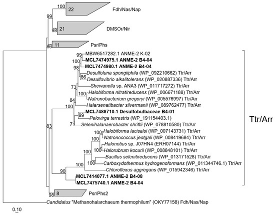 Unexpectedly, MAG B4-04 encoded proteins, which were annotated by RAST as two subunits of respiratory arsenate reductase ArrAB. PGAP annotated these proteins as molybdopterin-dependent oxidoreductase (MCL7474975 and MCL7474980—two copies of putative ArrA) and 4Fe-4S dicluster domain-containing protein (MCL7474976, putative ArrB). In the amino acid sequences of these proteins, we found the CX2CX3C motif, which is characteristic of ArrA and presumably anchors the [4Fe-4S] cluster, and the CX2CX2CX3C motif, which usually binds the [Fe-S] centers in ArrB. The putative ArrA had a high amino acid sequence identity with the corresponding subunit of the well-studied respiratory arsenate reductases from Chrysiogenes arsenatis [68] and Shewanella strain ANA-3 [69] (53% and 58%, respectively). Phylogenetic analysis showed that ArrA from MAG B4-04 falls in the Trr/Arr cluster (tetrathionate/arsenate reductase family) in the CISM superfamily (complex iron-sulfur molybdoenzymes) (Figure 4). To our knowledge, the presence of Arr genes in ANME was reported only for one MAG belonging to Candidatus Methanoperedens nitroreducens [64]. Our finding suggests that ANME-2 may also use Ar(V) as a terminal electron acceptor during the anaerobic oxidation of methane or another electron donor.