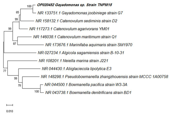 The nucleotide sequence of the purified PCR product was sequenced in both directions using the 27F and 1492R primers using an ABI 3730xI sequence analyzer (Applied Biosystems, USA). Subsequently, CodonCode aligner software v. 7.1.2 was used to assemble the forward and reverse DNA sequence reads. The sequence similarity search was performed at the National Center for Biotechnology Information (NCBI) server using BLASTN (http://www.ncbi.nlm.nih.gov/blast; accessed on 20 December 2022) and the EzTaxon-e server database [59]. The phylogenetic tree in the context of 16S rRNA gene sequence was constructed using the Neighbor-Joining method of the MEGA-X software (version 10.0.5) with a bootstrap analysis based on 1000 replicates.