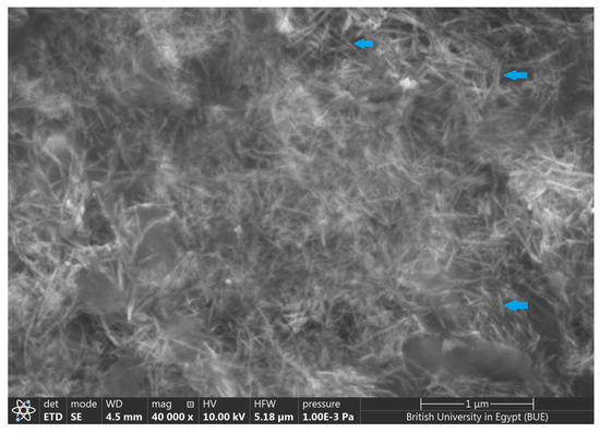 Scanning electron micrograph showing the rod-shaped biogenic TeNPs produced by Gayadomonas sp. TNPM15. The blue arrows indicate the formation of rod-shaped nanostructures.