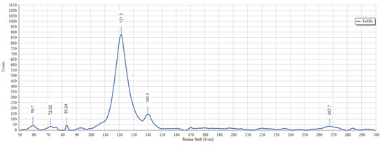 Biogenic TeNPs were produced by exploiting the tellurite-reduction capability of Gayadomonas sp. strain TNPM15 cultured in TYS broth supplemented with potassium tellurite. The produced intracellular TeNPs were recovered and resuspended in ultrapure water after purification steps. Electron microscopy was employed to clarify the size and shape of the purified nanoparticles. The TEM demonstrated that the purified TeNPs appeared as nanorods with a diameter range from 15 to 23 nm and different lengths reaching up to 243 nm (Figure 3). Moreover, SEM observation clearly confirmed the formation of rod-shaped nanostructures (Figure 4). Based on the results of elemental analysis by EDX, we evidenced that the black biogenic nanostructures were mainly composed of tellurium (Figure 5). Furthermore, the XRD spectrum revealed the crystalline nature of the produced TeNPs (Figure 6). Additionally, Raman spectra appeared in the whole lower-frequency region, showing characteristic vibration peaks attributed to tellurium at 121.3 and 140.3 cm−1, affirming the formation of TeNPs (Figure 7). In addition, the FTIR spectrum provided insights into the functional groups incorporated into the surface of the as-prepared biogenic tellurium nanostructures (Figure 8).