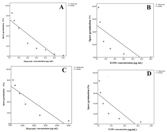 Linear regression model fit of spore germination. (A) F. oxysporum treated with mancozeb, (B) F. oxysporum treated with TeNPs, (C) A. alternata treated with mancozeb, (D) A. alternata treated with mancozeb.