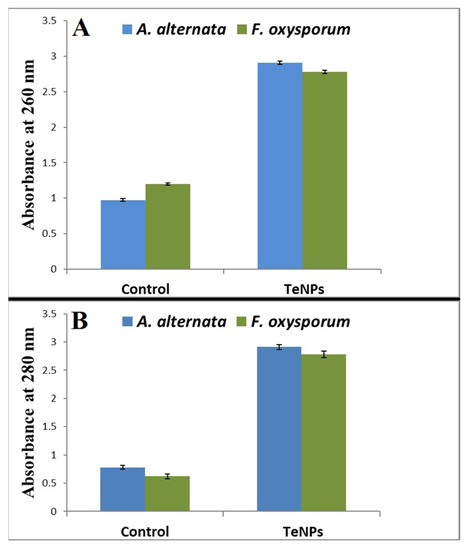 To gain further insight into the antifungal activity of TeNPs, we studied the probable leakage of proteins and DNA in TeNPs-treated spores compared with untreated control. The results revealed a significant increase in extracellular protein and DNA levels, indicating increased permeability of spore membrane and leakage of an intracellular substance (Figure 11). Likewise, TeNPs were more effective against A. alternata than F. oxysporum in the disruption of spore membranes.