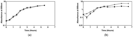Growth comparison of supplementation with sub-MIC levels of benzalkonium chloride (■) and without BAC (○). For some points, the error bars are shorter than the height of the symbol. In these cases, the error bars were not drawn: (a) Serratia marcescens ATCC 13880; (b) Serratia sp. HRI.