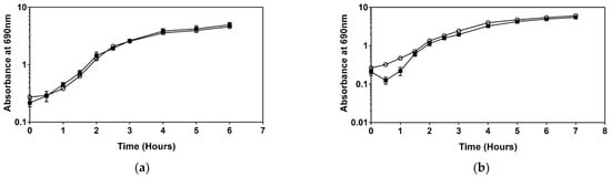 Growth comparison of supplementation with sub-MIC levels of DDAC (■) and without DDAC (○): (a) Serratia marcescens ATCC 13880; (b) Serratia sp. HRI.