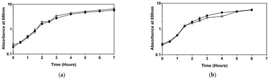 Growth comparison of supplementation with sub-MIC levels of Virukill (■) and without Virukill (○): (a) Serratia marcescens ATCC 13880; (b) Serratia sp. HRI.