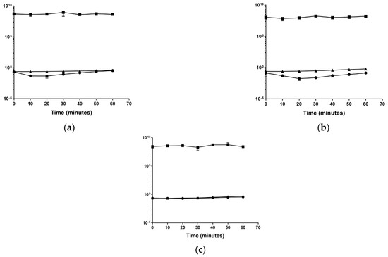 Comparison of changes in absorbance readings (●) and CFU/mL values for Serratia sp. HRI (■) as well as CFU/mL values of Serratia marcescens ATCC 13800 (▲) over 60 min cultivated in the presence of sub-MIC levels of disinfectants: (a) Benzalkonium chloride; (b) DDAC; (c) Virukill.
