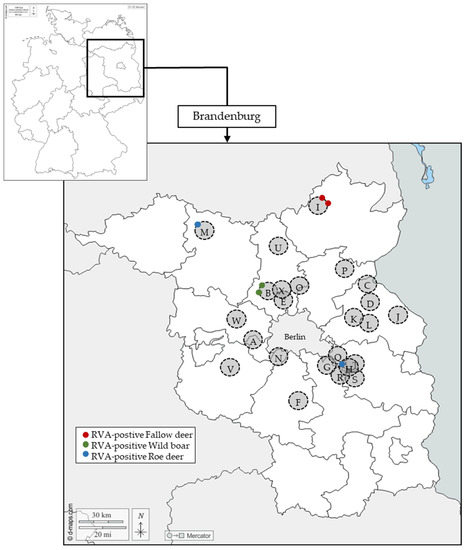 Location of the sampling sites of wild ungulates within different hunting areas (A–X) in Brandenburg, Germany. RVA-RNA-positive samples are shown by colored dots, as indicated in the box. The map was generated using d-maps.com (https://d-maps.com/carte.php?num_car=17879 and https://d-maps.com/carte.php?num_car=6198&lang=en accessed on 14 December 2022).
