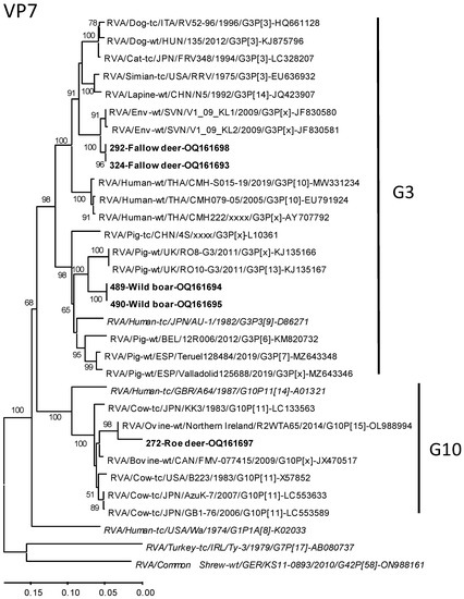 In detail, the tree, based on a 307 bp fragment of the VP7 gene (Figure 2), shows a clustering of the wild boar strains together with several other pig strains as well as the human genotype reference strain. The fallow deer strains branch very closely together with environmental sequences from Slovenia, which are embedded between a cluster of human strains and a cluster of dog, cat, simian, and lapine strains. The roe deer strain clusters together with different ovine and bovine strains.