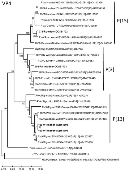 - Jamnikar-Ciglenecki, U.; Kuhar, U.; Steyer, A.; Kirbis, A. Whole genome sequence and a phylogenetic analysis of the G8P[14] group A rotavirus strain from roe deer. BMC Vet. Res. 2017, 13, 353. [Google Scholar] [CrossRef] [PubMed]