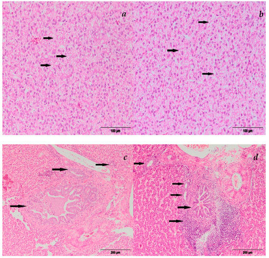 The addition of 0.2% of MR partially reduced the degree of PH changes in the target organs. The addition of 0.2% of MR could not completely neutralize the PH change. Our results are consistent with the reports of authors who used similar doses of mycotoxins and mycotoxin adsorbents in their experiments [,]. Since both AFB1 and T-2 toxin are primarily hepatotoxic, PH changes in the liver, but also in the heart and lymph tissues, are expected and are related to the metabolism and biotransformation of the toxin [].