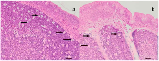 The small intestinal histopathology results are presented in Figure 1. In the duodenum, changes were in the form of mucosal surface destruction and necrobiotic changes in the nuclei of the Lieberkühn crypt cells. Vascular changes were in the form of the overfilling of blood vessels with blood/hyperemia and/or accumulation of extravasate in the intestinal wall—hemorrhage. Destruction of the duodenal mucosa was characterized by the necrosis of enterocytes. Necrotic enterocytes were scattered along the surface of the villi. The mucus-producing goblet cells in the villous epithelium were hyperplasic and prominent due to distention caused by the mucus. Lieberkühn crypt cells showed signs of necrobiotic nuclear change—karyopicnosis.
