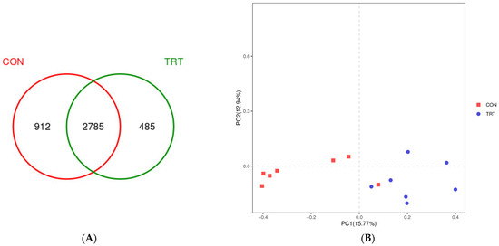 The flora in rumen fluid samples was subjected to paired-end sequencing, and raw data were filtered to obtain 2,871,736 high-quality reads, with an average of 191,450 reads per sample. Based on the 97% sequence similarity threshold, 4182 OTUs were obtained from 15 groups of rumen fluid samples, of which 3679 OTUs were detected in the CON group and 3270 OTUs were detected in the TRT group. In total, 2785 (66.59% of the total OTUs) were common to both groups (Figure 1A). The sequencing coverage in both groups was 98% (Table 4), indicating that the depth of the sequencing reflects the true microbial profile in the rumen fluid of calves. The observed_species and PD_whole_tree in the CON group were significantly higher than those in the TRT group (p < 0.05), indicating a higher species abundance in the CON group. There were no significant differences in other diversity indices, indicating that the difference in microbial diversity between the two groups was small. The results of a PCoA (Figure 1B) showed that there was only partial overlap in OTU frequencies between the two groups, with significant differences (p < 0.003), as well as significant differences among individuals within the CON group.