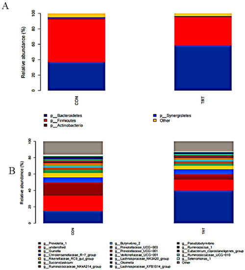 Compositions of the yak calf rumen microbiota under two feeding patterns. (A) Phylum level; (B) Genus level. CON: breastfeeding; TRT:milk replacer feeding.
