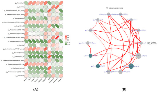 Correlation analysis of rumen genera from yak calves under two feeding patterns. (A) Correlations between the relative abundances of the top 20 genera with fermentation parameters. (B) Interactions among genera with the top 20 relative abundances. Red represents a positive correlation, and blue represents a negative correlation. The number indicates the correlation coefficient. * p > 0.05, ** p > 0.01. The size and color of the circle represent the relative abundance of the respective genus and phylum. CON: breastfeeding; TRT:milk replacer feeding.