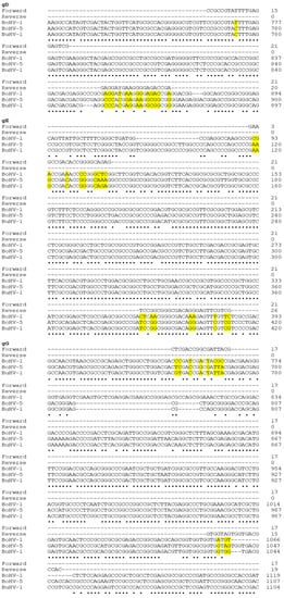 DNA sequence alignment for the portions of gD, gE and gG genes identified as targets to discriminate BuHV-1, BoHV-1 and BoHV-5. The symbol ‘•’ indicates monomorphic nucleotides. The yellow shadings indicate the polymorphic nucleotides (SNPs) at the primer attachment sites. The number of bases depicted in each line is marked by the number shown at the right.