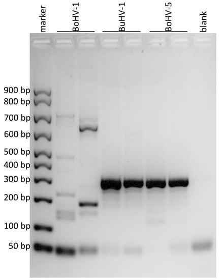 An analysis of the reference sequences deposited in GenBank for BuHV-1 (GenBank accession no. NC043054.1), BoHV-1 (GenBank accession no. NC001847.1) and BoHV-5 (GenBank accession no. KY549446.1) was performed to detect possible specific genetic sequences. The alignment of homologous viral gene sequences, by using the CLUSTAL OMEGA program (https://www.ebi.ac.uk/Tools/msa/clustalo/; accessed on 14 July 2021), allowed the identification of specific nucleotide sequences of BuHV-1, BoHV-1 and BoHV-5. In silico analysis of the sequence alignments concerned different genes encoding the following proteins: BICP22, BICP0, BICP4, DNA Polymerase, gB, gC, gD, gE, gG, gH, gI, gL, gM, TK, UL6, UL5, UL8, UL9, UL12, UL13, UL14, UL16, UL17, UL18, UL19, UL20, UL22, UL23, UL25, UL26, UL27, UL28, UL29, UL48, UL52, US3, US9. The design of the primers and the optimization of PCR assay were focused on genetic targets located on the gD, gE and gG genes. The detection of amplified products for gD, gE and gG was performed by using end-point PCR on agarose gel (1.8%) [32].