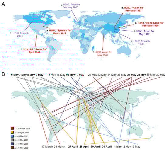 Chronological distribution of influenza A variants and sub-types. (A) Human flu viruses (in red) and five avian flu viruses (in purple) capable of infecting humans. The different colors on the world map (from light to deep blue) are here to show the different geographical areas or countries. The time when the virus first appeared in this world is mapped out. Lowercase letters (a–i) display the order in which the influenza A viruses appeared. The four human flu viruses (H1N1, H2N2, H3N2, 2009 H1N1) in bold indicate that they have caused global pandemics, posing a serious threat to human health. H5N1 avian flu virus in bold suggests that it arouses global concern as a potential pandemic threat. (B) The first reporting of 2009 H1N1 virus. The first confirmed cases were documented in Mexico on 17 March 2009. Then, the human outbreak of 2009 H1N1 virus rapidly spread to other countries within 2–3 months (from 17 March to 30 May 2009). The six colors of lines stand for different time periods individually. The twelve dates in bold represent that the virus was simultaneously showing up in two or more places in the world.