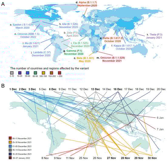 Accumulating evidence suggested that the more frequently SARS-CoV-2 virus spreads, the higher the viral mutation rates that can occur. In the start of the COVID-19 pandemic, the possibility of mutations in the SARS-CoV-2 genome was relatively low, with limited numbers of people infected. However, due to huge numbers of infections and long-term infections in immunocompromised patients, the variations of SARS-CoV-2 have been continuously appearing [73]. During late 2020, the WHO recommended the classification of novel SARS-CoV-2 strains as variants of interest (VOIs) and variants of concern (VOCs) [74]. VOIs contain genetic changes that are predicted to alter virus characteristics such as transmissibility, disease severity and immune escape, with significant community transmission or international spread. A VOC is defined as a virus that carries multiple mutations compared with the reference genome, with powerful evidence to support the increased transmissibility, virulence or a decrease in the response to vaccines and therapies [75,76]. The first report of each new variant is now indicated in the world map (Figure 2A). According to this map, a dozen different variants of SARS-CoV-2 appeared in the world within one year, indicating that the viral genome mutated rapidly. We also found that more than one variant occurred in the same country, such as three different variants in the USA, and two different variants in Brazil, India and South Africa. We postulated that this might be related to the wide spread of COVID-19 infection, resulting from a poor COVID-19 vaccination rates and inadequate preventive measures in these countries. Therefore, reasonable precautions and expanding vaccine coverage are extremely important to prevent the mutations of the virus and to effectively control the COVID-19 pandemic. In addition, at the time of this writing, Epsilon (B.1.427 and B.1.429), Zeta (P.2), Kappa (B.1.617.1), Iota (B.1.526), Mu (B.1.621), Eta (B.1.525), Lambda (C.37) and Theta (P.3) are considered as previously circulating VOIs, due to the steep decline in circulation of the variants. Likewise, Alpha (B.1.1.7), Beta (B.1.351.1), Delta (B.1.617.2) and Gamma (P.1) are designated as previously circulating VOCs, which have been demonstrated to no longer pose a major added risk to global public health compared to other circulating SARS-CoV-2 variants such as Omicron (B.1.1.529), a variant first detected in South Africa.