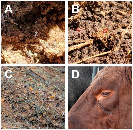House flies associate with animals, their waste, and feed in livestock operations. House fly eggs (A) and pupae (B) in cattle manure. Adult house flies feeding on food in feed bunk (C) and cattle eye secretions (D). Photos by Victoria Pickens.