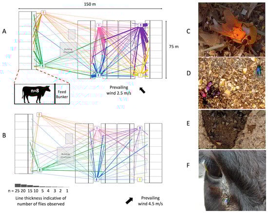 House fly movement within a concentrated animal feeding operation. Location of colored flies observed 1 h (A) and 24 h (B) after release. Flies were predominantly observed in feed bunkers containing animal feed (C,D) though also on manure (E) and animals (F). Photos by Cassandra Olds.