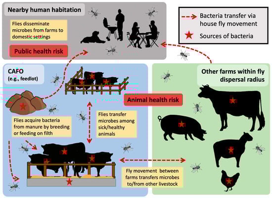 As outlined above, in animal feeding operations, flies have access to sources of microbes (from animals and their waste) and move about freely among these sources and the animals’ food, water, and environment (Figure 3). The propensity of flies to freely move between sanitary and unsanitary areas in animal production operations has important implications for the movement of pathogenic, and potentially antimicrobial-resistant microbes. Flies are regularly found to have bacteria associated with animal waste such as fecal coliforms and enteric pathogens that they likely acquire from manure. Flies also have been implicated in the movement of bacterial pathogens of bovine respiratory disease (BRD) because they carried the causative agents—M. haemolytica, P. multocida, and H. somni—around pen areas housing cattle with apparent BRD symptoms [58]. Whether flies acquired those bacteria from the sick animals in the pen or were involved in the transmission was not determined. Nonetheless, sanitation or disease-limiting efforts such as cleaning out pens and piling waste, separating sick animals from well ones, or separating types of animals in a multi-species production setting can be easily undermined if fly control is not effective.