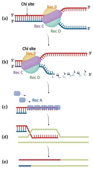 - Murphy, K.C. Lambda Gam protein inhibits the helicase and chi-stimulated recombination activities of Escherichia coli RecBCD enzyme. J. Bacteriol. 1991, 173, 5808–5821. [Google Scholar] [CrossRef]