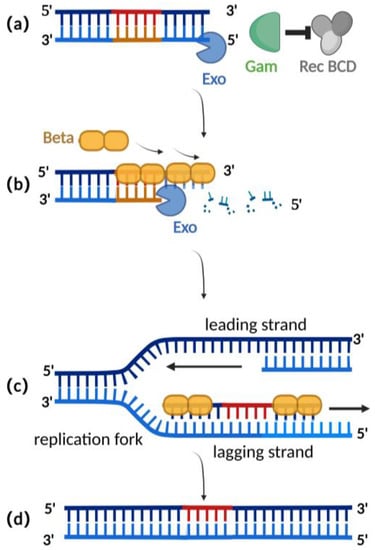- Rybalchenko, N.; Golub, E.I.; Bi, B.; Radding, C.M. Strand invasion promoted by recombination protein beta of coliphage lambda. Proc. Natl. Acad. Sci. USA 2004, 101, 17056–17060. [Google Scholar] [CrossRef] [PubMed]