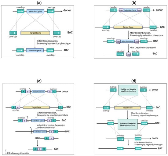 - Wang, S.; Zhao, Y.; Leiby, M.; Zhu, J. A new positive/negative selection scheme for precise BAC recombineering. Mol. Biotechnol. 2009, 42, 110–116. [Google Scholar] [CrossRef] [PubMed]