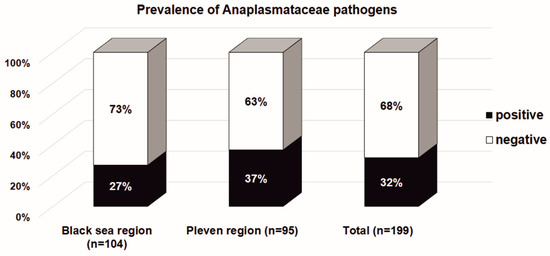 In conclusion, our study presents epidemiological data for the rate of infection with pathogens belonging to the family of Anaplasmataceae in Ixodes ricinus ticks collected from two regions of Bulgaria: the Pleven and Black Sea Coast regions. The detection was performed by molecular identification of the pathogens’ DNA sequences. Generally, the Pleven region presents a higher frequency of infected ticks with studied pathogens. Although the fed or semi-fed ticks may be newly infected, since it is not known whether the pathogens’ DNA was in a tick or from the animal’s blood, all ticks collected from the region of Pleven were collected from the vegetation by flagging and were unfed. Therefore, we may accept the Pleven region as a site with a higher prevalence of ticks infected naturally with Anaplasmataceae than the Black Sea Coast region. In addition, the distribution of Ehrlichia canis in ticks from the two regions did not reach a significant difference, while the prevalence of Anaplasma phagocytophilum in the Pleven region was significantly higher than that found in the Black Sea coast region.