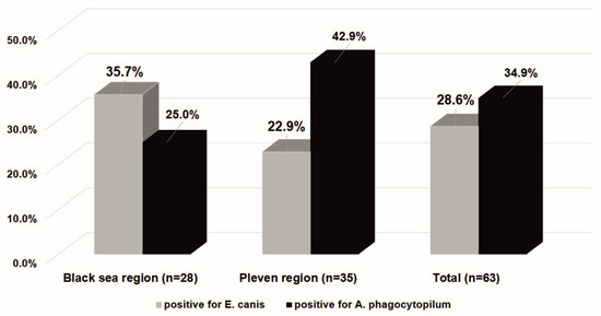 A difference in the infection rate of A. phagocytophilum between the two studied regions was observed. The infection rate amongst Anaplasmataceae-positive ticks was seen to be higher in the Pleven region than in the Black Sea region (42.9%; 15 of 35 vs. 25%; 7 of 28; χ2 = 2.183; df = 1; p = 0.140). The difference reached a statistical significance when considering all of the tested ticks within this study (15.8%; 15 of 95 vs. 6.7%; 7 of 104; χ2 = 4.143; df = 1; p = 0.042). In the Black Sea region, the infection rate of E. canis was more common than infection with A. phagocytophilum, contrary to the Pleven region (Figure 3).